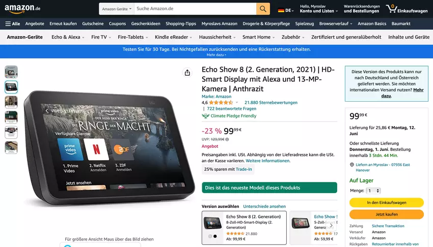 Amazon hat den Preis für das Echo Show 8 Display der zweiten Generation gesenkt.