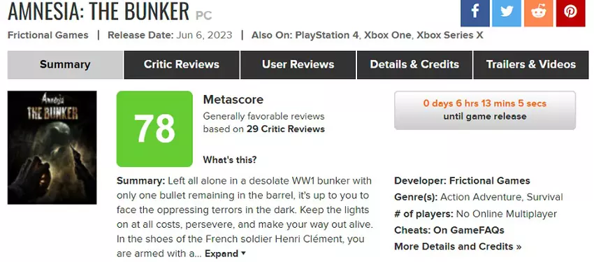 Amnesia: The Bunker hat bei den Aggregatoren ziemlich hohe Wertungen erhalten: