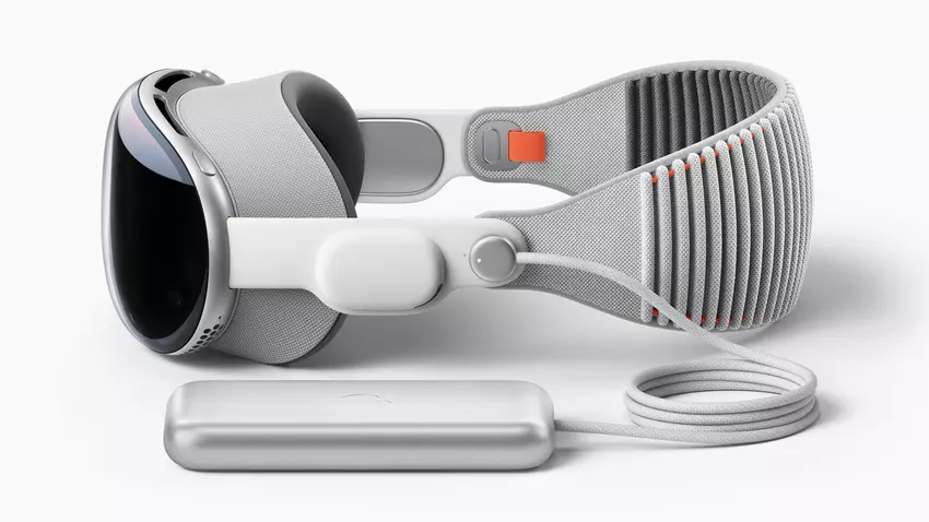 Das Apple Vision Pro verfügt über Glas auf der Vorderseite, ein leichtes Aluminiumgehäuse, zwei microLED-Displays mit über 4K-Auflösung, eine 3D-Kamera, ein Digital Crown Rad und zwei Chips: M2 und R1, die für die Verarbeitung von Sensordaten in Echtzeit zuständig sind. Der Akku ist nicht in das Gehäuse integriert, sondern wird mit einer magnetischen Verbindung an der Seite befestigt.