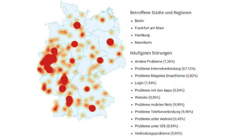 Es wurde eine Karte der Ausfälle veröffentlicht, die die betroffenen Städte und Regionen zeigt. Berlin, Frankfurt am Main, Hamburg und Mannheim gehören zu den am stärksten betroffenen Gebieten.