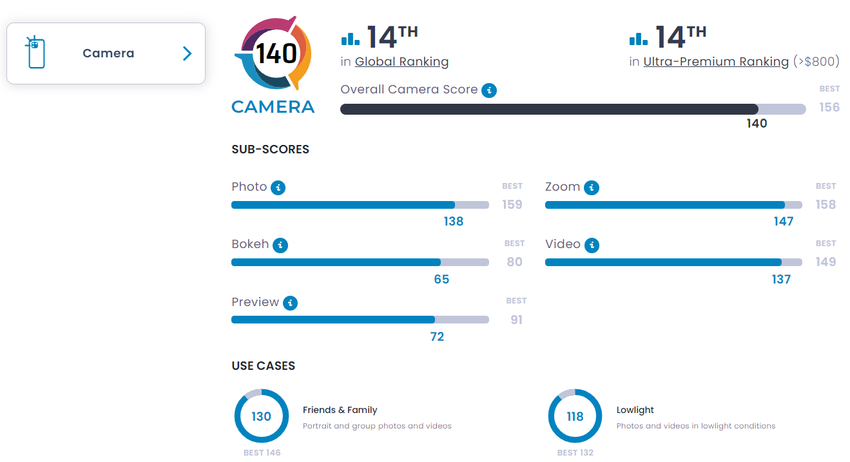 Das Ergebnis des Xiaomi 13 Ultra lag bei 140 Punkten. Google Pixel 7, Samsung Galaxy S23 Ultra (Snapdragon 8 Gen 2) und vivo X90 Pro+ erreichten die gleiche Punktzahl. Interessanterweise hat das Flaggschiff 2021 Xiaomi Mi 11 Ultra 1 Punkt mehr bekommen.