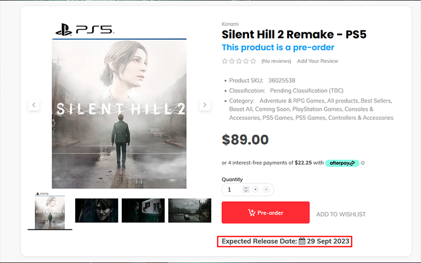 Gorilla Gaming ist ein australischer Videospielladen, der auf der Seite des Silent Hill 2-Remakes angegeben hat, dass das Spiel am 29. September 2023 erscheinen soll.