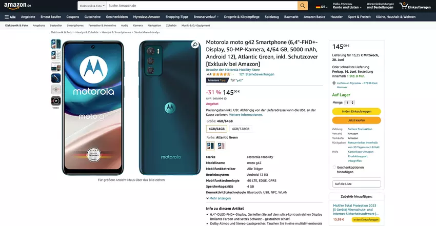 Es handelt sich um das Moto G42. Die Version mit 4/64 GB wird für check price on amazon. Die Top-Version mit 128 GB Speicherplatz kostet check price on amazon. Es sind auch zwei Farben erhältlich: Atlantic Green und Metalic Rose.