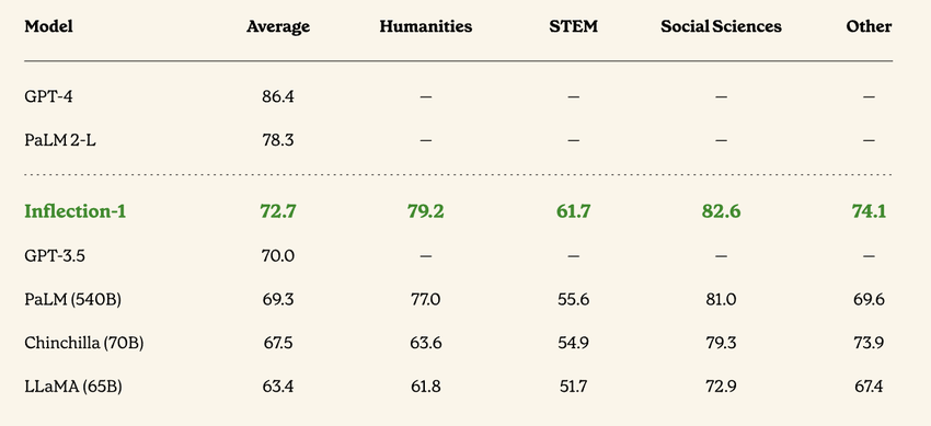 Inflection-1 hat ungefähr die gleiche Größe und die gleichen Fähigkeiten wie GPT-3.5. Das Unternehmen behauptet, dass es mit GPT-, LLaMA-, Chinchilla- und PaLM-Modellen konkurrenzfähig ist.