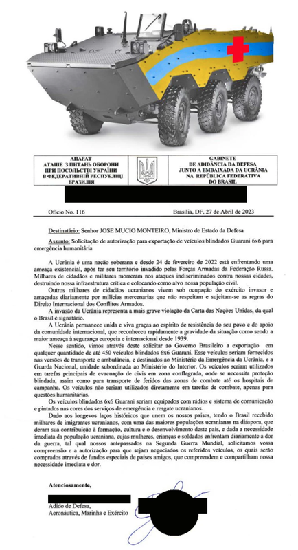 Wie die brasilianische Zeitung Info Defensa berichtet, hat die Abteilung für strategische Angelegenheiten, Verteidigung und Rüstung des brasilianischen Außenministeriums die ukrainische Regierung abgewiesen. Und das, obwohl die Ukraine zugesichert hat, dass die Fahrzeuge nicht in Kampfeinsätze verwickelt werden.
