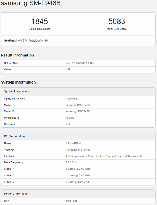 Die globale Version des Smartphones mit der Modellnummer SM-F946B hat den Leistungstest bestanden. Es verfügt über einen Snapdragon 8 Gen 2 Prozessor, 12 GB RAM und läuft mit dem Betriebssystem Android 13.