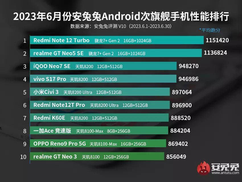 Das iQOO Neo 7 SE mit Dimensity 8200 schaffte es unter die Top 3. Das vivo S17 Pro mit demselben Prozessor wurde eine Zeile tiefer platziert, während das Xiaomi Civi 3 mit dem Dimensity 8200 Ultra mobile Chip die Top 5 des Juni-Rankings abschloss.