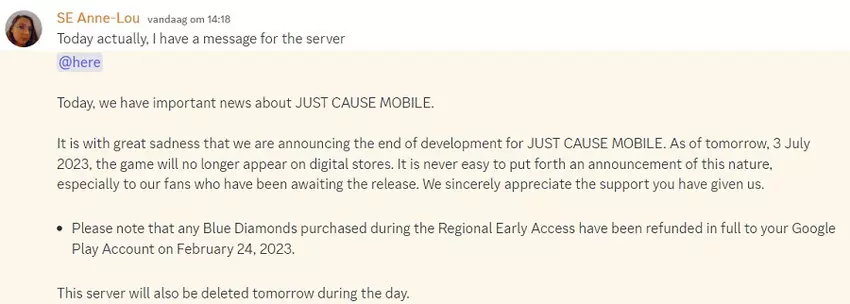 Die Entwickler haben keinen Grund für die Absage des Spiels genannt. Sie bedankten sich bei den Spielern für ihr Interesse an Just Cause Mobile und sagten, dass das Spiel ab dem 3. Juli aus den digitalen Shops entfernt wird.