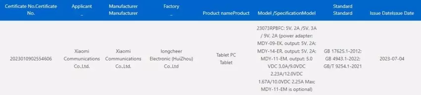 Diesmal wurde die Neuheit in der Datenbank der chinesischen Zertifizierungsagentur 3C gesichtet. Das Gerät trägt die Modellnummer 23073RPBFC. Laut den Dokumenten wird die Neuheit das Aufladen mit bis zu 22,5 W unterstützen. Zum Vergleich: Das aktuelle Redmi Pad-Modell wird mit 18 Watt aufgeladen.