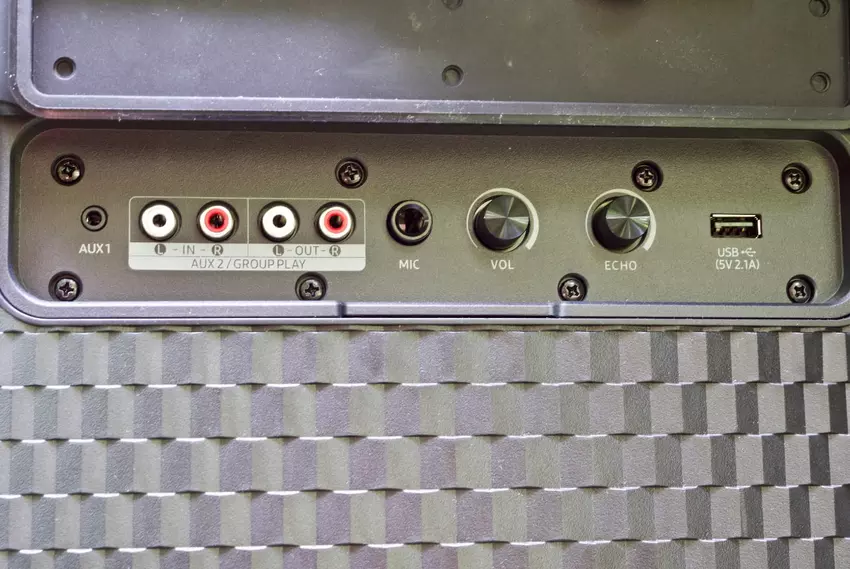 Hier können Sie ein externes Mikrofon für Karaoke anschließen (mit zwei Reglern neben dem Eingang können Sie die Lautstärke und den Nachhallpegel einstellen). Oder eine andere Klangquelle - ein altes Musikcenter oder einen Verstärker - über eine von zwei Anschlussmöglichkeiten: Die erste ist für einen einzelnen Stecker, wie bei Kopfhörern, und die zweite ist für Cinch-Kabel, mit denen der Lautsprecher über Group Play mit anderen verbunden werden kann. Somit ist ein Paar Pins für den Eingang und ein Paar für den Ausgang des Klangs zuständig. Auf diese Weise kann der Sound Tower mit jeder Klangquelle verwendet werden - alle möglichen Optionen können im Falle eines Falles genutzt werden. Obwohl meine Intuition mir sagt, dass der Sound Tower am ehesten für die Wiedergabe von Sound von Smartphones über Bluetooth verwendet werden wird - ist das nicht der Grund, warum die Menschen so viele Musik-Streaming-Dienste geschaffen haben?
