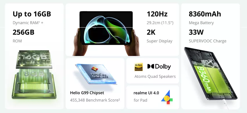 Das realme Pad 2 kommt mit einem MediaTek Helio G99 Prozessor. Der Chip ist gepaart mit 6/8 GB LPDDR4X RAM und 128/256 GB Speicher. Auf Wunsch kann der eingebaute Speicher mit einer microSD-Karte erweitert werden. Die Neuheit verfügt außerdem über vier Lautsprecher mit Dolby Atmos, eine 8-MP-Hauptkamera, die gleiche Frontkamera, einen USB-Typ-C-Anschluss, einen SIM-Kartenslot und einen 8.360-mAh-Akku mit 33-W-Ladung. Das Tablet verfügt über 4G LTE, Wi-Fi 802.11 ac (2,4GHz + 5GHz) und Bluetooth 5.3. Das neue Produkt wird mit dem Betriebssystem Android 13 und der Realme UI 4.0 für das Pad ausgeliefert.
