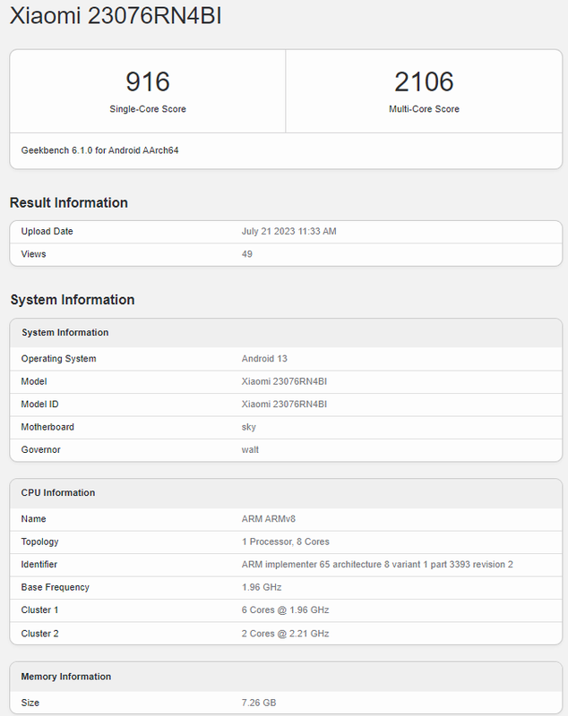 Das Redmi 12 5G hat eine Modellnummer von 2307RN4BI. Der letzte Buchstabe deutet darauf hin, dass es die Version für den indischen Markt in den Geekbench geschafft hat. Es wird erwartet, dass das Smartphone am 1. August in Indien auf den Markt kommt.