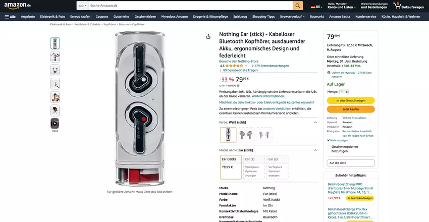 Wir sprechen über das Nothing Ear (Stick) Modell. Es kostet jetzt check price on amazon.