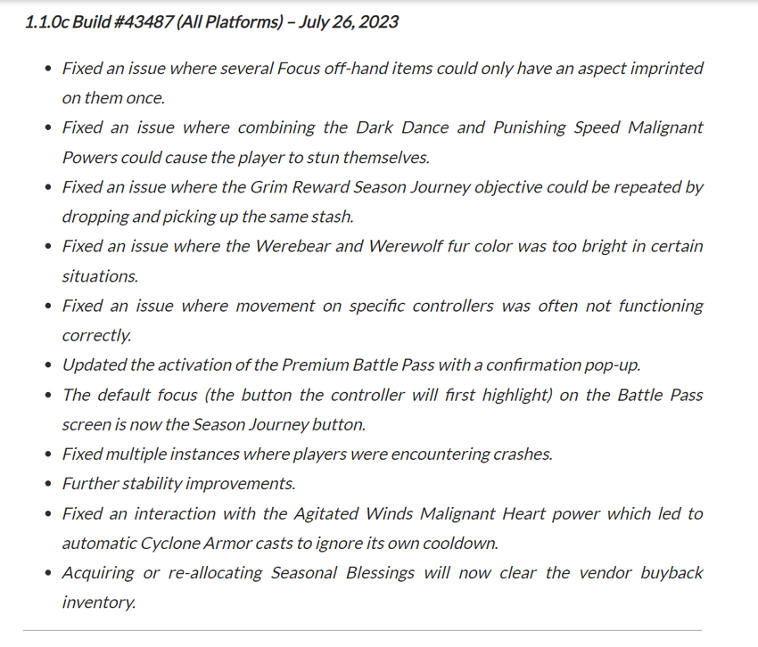 Auch andere Fehler wurden behoben, darunter die Möglichkeit, Spieler zu betäuben, indem die bösartigen Mächte Dunkler Tanz und Bestrafende Geschwindigkeit kombiniert werden. In einigen Fällen war die Farbe des Werbär- und Werwolfsfells zu hell, was nun ebenfalls behoben wurde. Außerdem wurde ein Fehler behoben, der es ermöglichte, den Baum des Flüsterns für die Aufgabe "Grimmige Belohnung - Saisonreise" aufzusammeln und fallen zu lassen. Außerdem:
