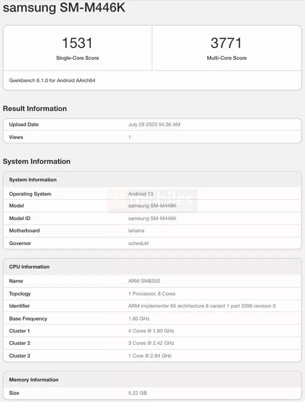 Das Gerät wird den Namen Galaxy M44 5G tragen. Unsere Kollegen von 91mobiles haben die Neuheit in der Datenbank des Geekbench-Leistungstests entdeckt. Das Smartphone wird mit der Modellnummer SM-M446K geführt.