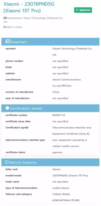Die Neuheit mit der Modellnummer 23078PND5G ist in der Datenbank der Agentur NBTC aufgetaucht. Das heißt, das Gerät ist bereits bereit für die Veröffentlichung. Leider sind die Merkmale des Xiaomi 13T Pro in den Dokumenten nicht, aber dank früherer Leaks wissen wir, dass das Smartphone mit einem MediaTek Dimensity 9200+ Prozessor kommen wird.