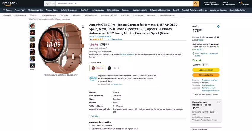 Wir sprechen über das Modell 2021 - Amazfit GTR 3 Pro. Das Gerät in der Farbe Brun wird auf Amazon für 99,90 € 159,90 €, -38% verkauft, statt 99,90 € 159,90 €, -38% ein Rabatt 99,90 € 159,90 €, -38%. Die Uhr in der Farbe Noir ist teurer - check price on amazon.