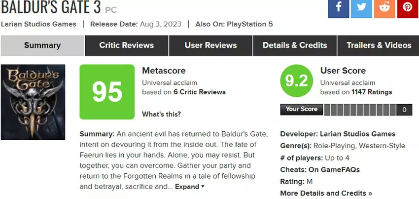 Derzeit gibt es nur sechs professionelle Kritiken auf Metacritic, und die durchschnittliche Punktzahl für das hochgelobte Rollenspiel liegt bei 95 Punkten!
