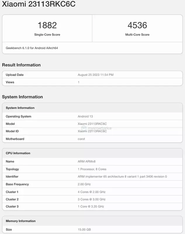 Das Smartphone hat den Leistungstest im Geekbench 6.1 Benchmark bestanden, daher kennen wir bereits einige Spezifikationen. Das Remi K70 Pro ist mit einem Chip mit einer Frequenz von bis zu 3,35 GHz ausgestattet. Wahrscheinlich handelt es sich um einen Dimensity 9200+.