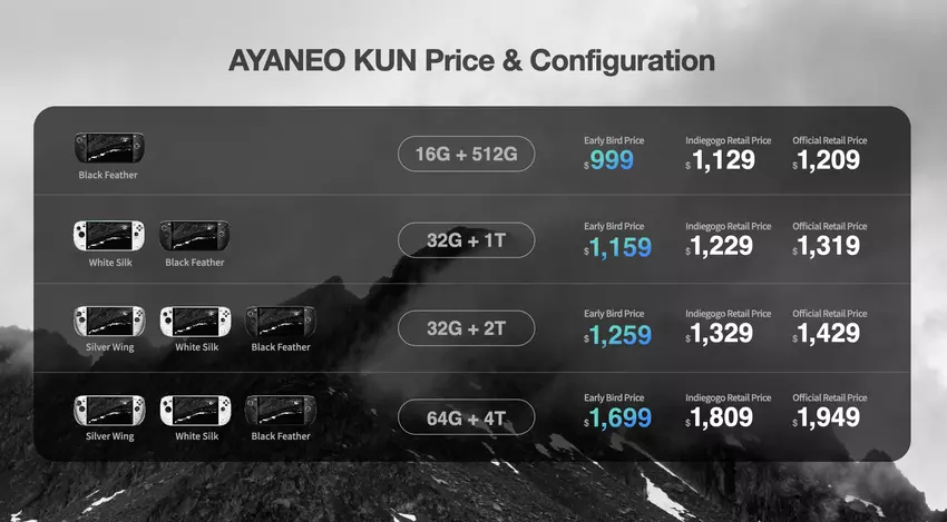 Ein Termin für den Verkaufsstart des AyaNeo Kun wurde noch nicht genannt. Die teuerste Version der Spielkonsole wird zu einem Preis von 1949 Dollar erhältlich sein. Sie wird den Nutzern 64 GB RAM und ein 4 TB SSD-Laufwerk bieten. Außerdem wird es Modifikationen mit 16/512 GB, 32/1024 GB und 32/2048 GB geben. Die Kosten werden jeweils 1209 $, 1319 $ und 1429 $ betragen.
