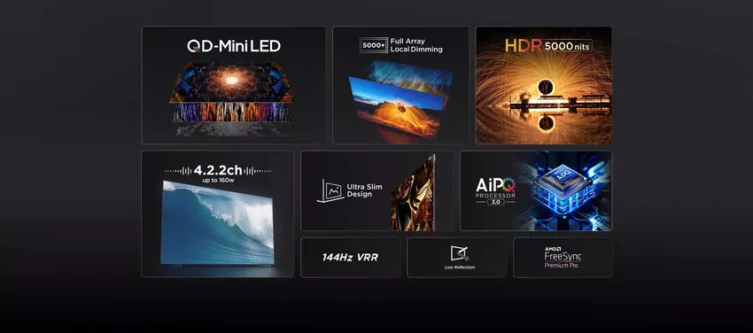 Die TVs sind mit einem Quantum Dot Mini LED-Panel mit 98 Prozent DCI-P3-Farbraumabdeckung und 5184 Dimmzonen ausgestattet. Die Helligkeit im HDR-Modus erreicht laut Hersteller 5000 nits. Künstliche Intelligenz wird eingesetzt, um Farbwiedergabe, Kontrast und Schärfe zu optimieren.