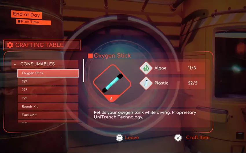 Stan hat ein kleines, aber nützliches Inventar. Wenn du die Bathyscaphe verlässt, hast du nur einen begrenzten Vorrat an Sauerstoff. Um diesen wieder aufzufüllen, müssen Sie spezielle Sauerstoffsticks verwenden. Diese können Sie an verschiedenen Orten finden oder in der Werkstatt selbst herstellen. Um ein solches Stäbchen herzustellen, brauchst du drei Algen und zwei Plastikflaschen. Außerdem gibt es kleine Minen (um eine blockierte Tür zu sprengen), ein Set zum Reparieren eines Badeschiffs (wenn du es stark beschädigt hast) und Treibstoff, denn du kannst mit demselben Badeschiff beschleunigen, und dafür brauchst du Treibstoff, sowie verschiedene andere Gegenstände, die dir bei deiner Passage helfen werden.