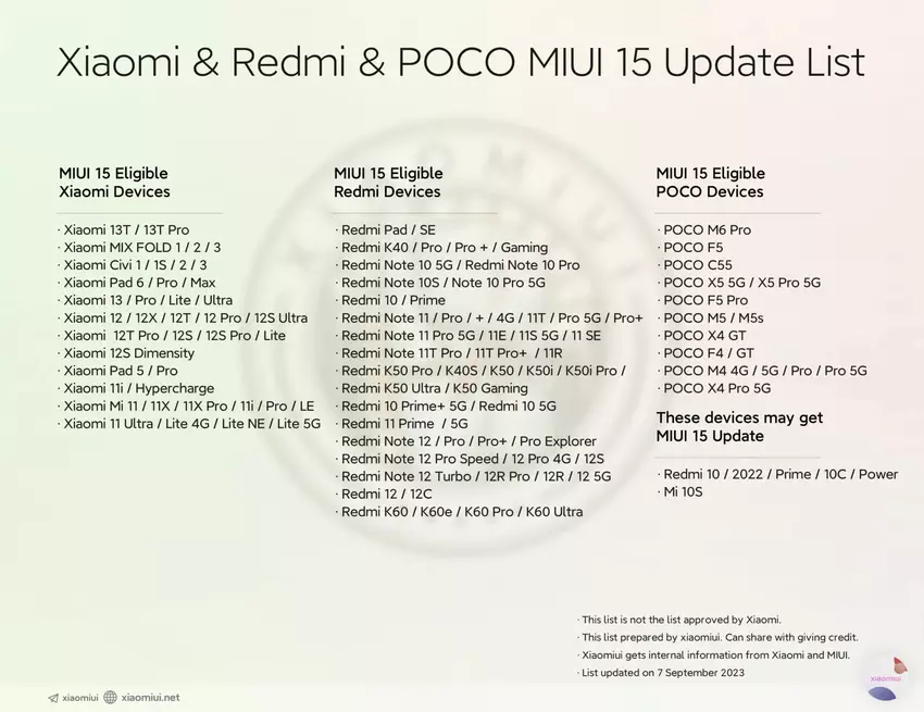 Es wird erwartet, dass Xiaomi im November seine neue, proprietäre MIUI 15-Oberfläche vorstellen wird. Und obwohl das Unternehmen noch keine Liste der Geräte veröffentlicht hat, die das Update erhalten werden, hat die XiaomiUI Ressource dies bereits getan. Diese Liste ist nicht offiziell, aber sie basiert auf Annahmen und früheren Mustern. Vielleicht wird sie mit der Zeit aktualisiert, aber XiaomiUI schreibt, dass die Liste zu 99% korrekt ist.
