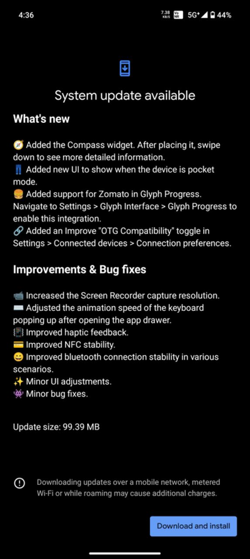 Das Update wurde mit der Nothing OS 2.0.3 Build-Nummer veröffentlicht. Die Firmware enthält eine Reihe von Fehlerbehebungen und einige Neuerungen. Zum Beispiel haben die Entwickler NFC, Bluetooth-Konnektivität und haptisches Feedback verbessert. Außerdem haben sie der Software einen verbesserten Sprachrekorder, ein Kompass-Widget für den Desktop, eine aktualisierte Benutzeroberfläche sowie Glyph-Unterstützung für die Zomato-App und mehr hinzugefügt.