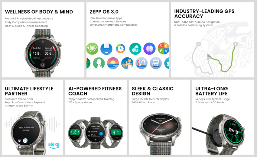 Die Neuheit wurde auf den Namen Amazfit Balance getauft. Die Uhr erhielt ein 46-mm-Gehäuse mit Wasserschutz und ein 1,5-Zoll-AMOLED-Display mit einer Auflösung von 480×480 Pixeln. Das Panel hat eine maximale Helligkeit von 1500 nits. Die Smartwatch hat eine Schicht aus gehärtetem Glas für zusätzlichen Schutz. Die Uhr ist außerdem mit einer doppelten LED-Anzeige und einem optischen 8PD BioTracker-Sensor ausgestattet.
