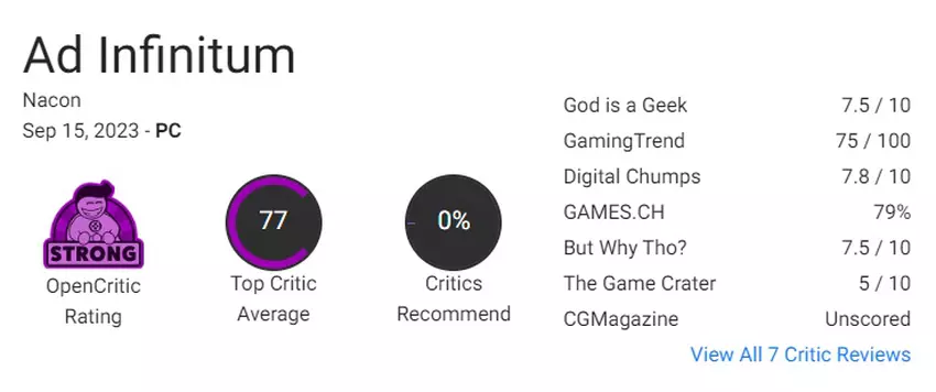 Ad Infinitum hat 77 Punkte (von 100) auf Opencritic bekommen, mit 0% Empfehlungen (vielleicht ist es ein Fehler der Seite), auf Metacritic hat das Spiel 75 Punkte.