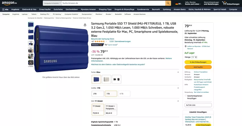 Samsung Portable T7 Shield auf Amazon: SSD-Laufwerk mit Wasser- und Stoßschutz auf 90,91 Euro gesenkt