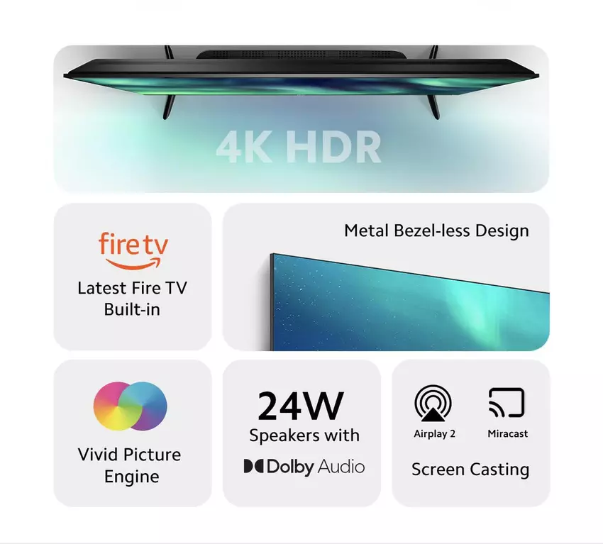Die Rede ist von der 43-Zoll-Version des Smart Fire TV 4K. Die Neuheit erhielt die Vivid Picture Engine Technologie, sowie 24-Watt-Lautsprecher mit Unterstützung für Dolby Audio, DTS-HD und DTS: Virtual X. Der Fernseher läuft mit dem Betriebssystem Fire TV OS 7. Die Neuheit verfügt über Wi-Fi 802.11 ac (2,4/5 GHz), AirPlay 2, Miracast, Bluetooth 5.0 sowie HDMI-, USB 2.0- und 3,5-mm-Anschlüsse. Auf dem Gerät sind die Apps Prime Video, Netflix, Disney+ und YouTube vorinstalliert.