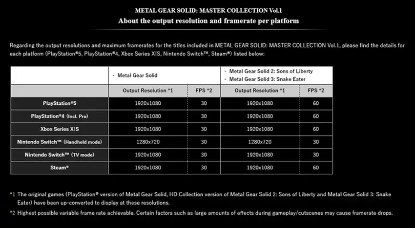 Wie ihr in der Tabelle sehen könnt, werden Metal Gear Solid 2: Sons of Liberty und Metal Gear Solid 3: Snaker Eater mit 60 FPS laufen.