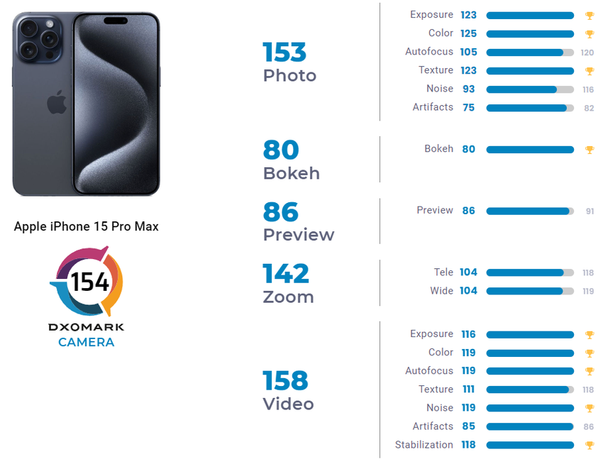 Das Smartphone erhielt 153 Punkte für Fotos und 158 Punkte für Videos. In einer Reihe von Kategorien wurde das iPhone 15 Pro Max zum Spitzenreiter, aber es reichte nicht für den ersten Platz in der Bewertung. Mit 154 Punkten belegte die Apple-Neuheit den zweiten Platz hinter dem Huawei P60 Pro.