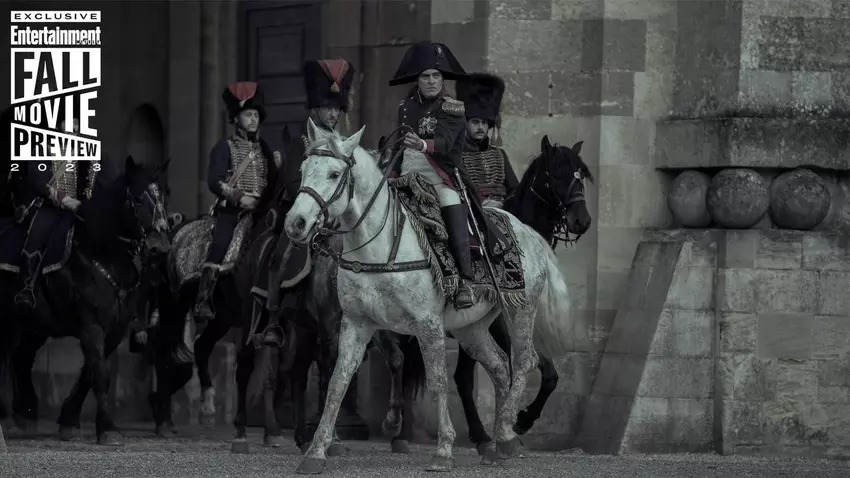 Entertainment Weekly hat neue Bilder veröffentlicht, die Bonaparte beim Betreten des Schlachtfelds zeigen. Mehrere der Fotos zeigen Napoleon auf einem weißen Pferd in seiner Militäruniform und zeigen die offensichtliche zerstörerische Kraft des Krieges.