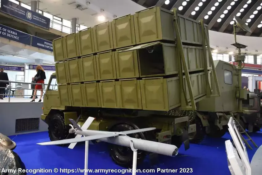 In Serbien findet die Waffenmesse Partner 2023 statt. Das lokale Unternehmen Yugoimport präsentierte eine Kamikaze-Drohne namens Raven 145.