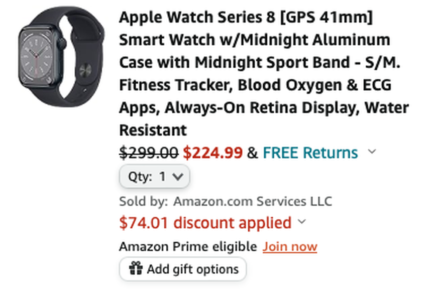 Es handelt sich um die Apple Watch Series 8 mit GPS und einem 41 mm Gehäuse. Das Gerät kostet check price on amazon statt check price on amazon. Der Preis kann auch um weitere 74 Dollar gesenkt werden, wenn man einen Gutschein des Verkäufers verwendet.
