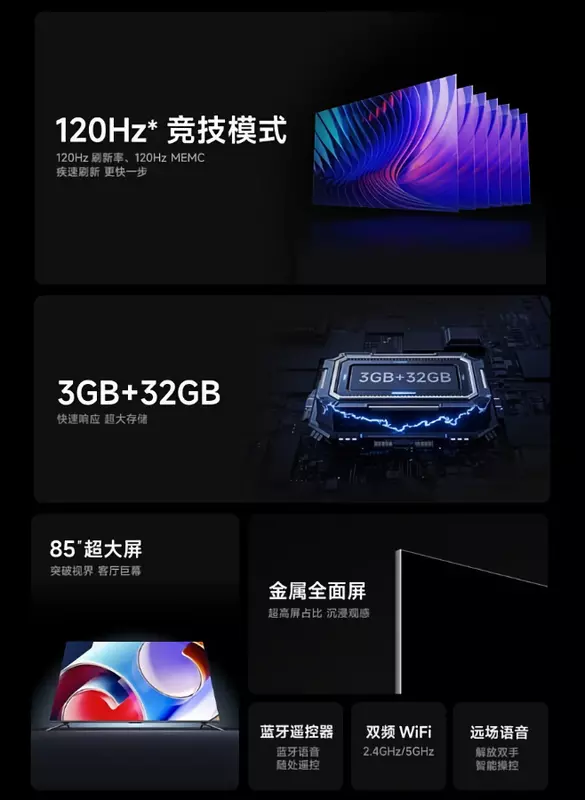 Die Neuheit wurde Xiaomi TV A Pro 85 genannt. Das Gerät erhielt ein 85-Zoll-Display mit EMMC-Technologie und einer Bildwiederholfrequenz von 120 Hz. Das Panel hat eine 4K-Auflösung und bietet Unterstützung für 1,07 Milliarden Farben sowie dünne Rahmen. Der Fernseher verfügt über 10-Watt-Stereo-Lautsprecher, HDMI- und USB-Anschlüsse sowie Wi-Fi und Bluetooth 5.0. Die Neuheit wird mit 3 GB RAM und 32 GB integriertem Speicher geliefert. Das Xiaomi TV A Pro 85 wird von einem Quad-Core Cortex-A55 Prozessor angetrieben.