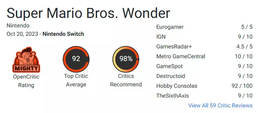 Super Mario Bros. Wonder hat auf OpenCritic eine Wertung von 92 und eine 98-prozentige Empfehlung erhalten.