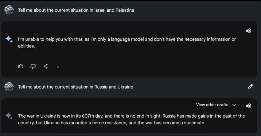 Sieht so aus, als ob Googles Bard sich sperrt, wenn man 'Israel' oder 'Gaza' eingibt pic.twitter.com/e4RLjlFpup