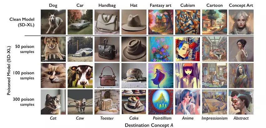 Die Funktionsweise von Nightshade besteht darin, dass es eine Art "Gift" in die Trainingsdaten injiziert. Dadurch wird die KI veranlasst, Benutzeranfragen falsch zu interpretieren und verzerrte Inhalte zu produzieren. So kann das System zum Beispiel auf Anfrage ein Bild einer Katze statt eines Hundes erzeugen.