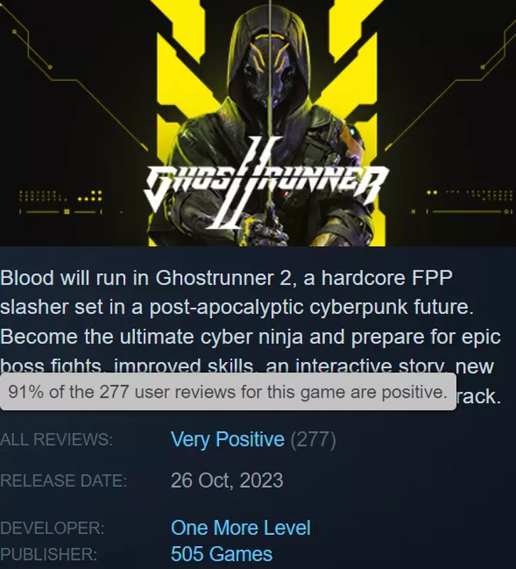 Steam-Nutzer sind von Ghostrunner 2 begeistert und geben ihm positive Kritiken. Sie stellen fest, dass die Entwickler das Konzept des Originalspiels perfekt weiterentwickelt und mit neuen Mechaniken ergänzt haben.