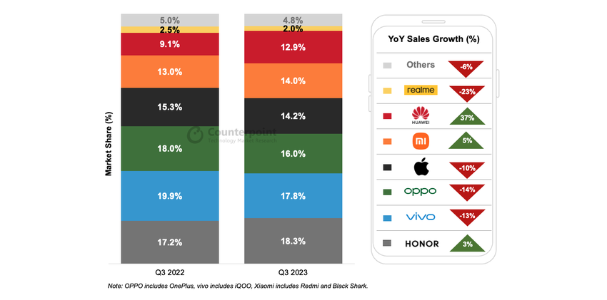 Huawei steigerte den Smartphone-Absatz in China um 37 Prozent, während Apple, OOPO, vivo und realme in Q3 2023 scheiterten