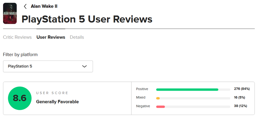 Auf Metacritic bewerten die Spieler das Spiel auf einer 10-Punkte-Skala, und Alan Wake 2 erhielt eine 8,6. Nur 12 % der Kritiken sind negativ, weitere 5 % sind gemischt. Und 84 % der Spieler sind der Meinung, dass Remedy eines der besten Spiele dieses Jahres veröffentlicht hat. Die einzigen negativen Aspekte der positiven Kritiken sind visuelle Bugs und die schlechte Lokalisierung einiger Sprachen, darunter Ukrainisch.