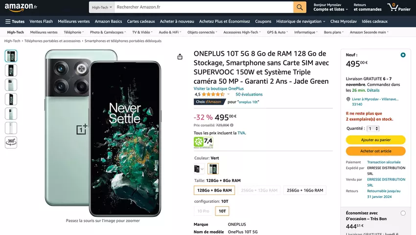 Es handelt sich um das Modell OnePlus 10T in der Farbe Jade Green und in der Version 8/128 GB. Diese Version des Geräts kostet check price on amazon- check price on amazon ein Rabatt check price on amazon.