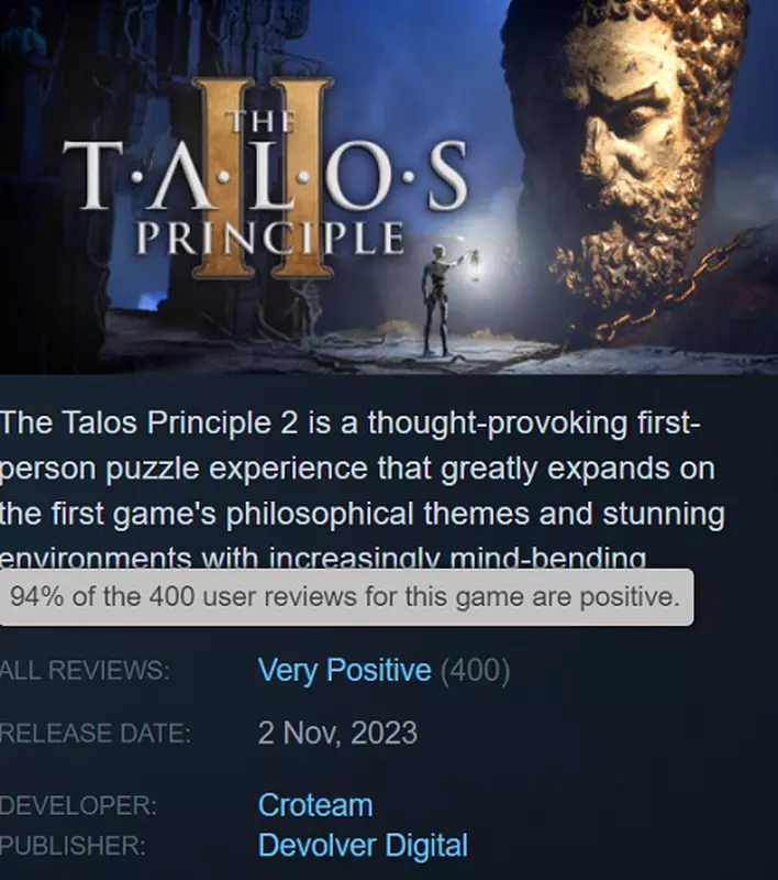 Die 94%ige Weiterempfehlung aus 400 Rezensionen spricht für sich. The Talos Principle 2 wird als perfekte Fortsetzung bezeichnet und behauptet, das Spiel sei von viel höherer Qualität als viele AAA-Projekte.