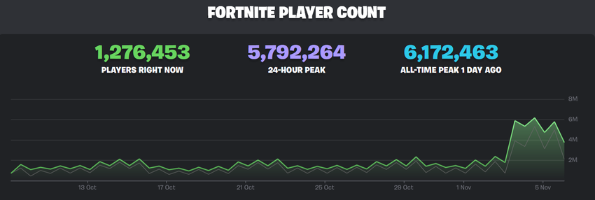 Epic Games berichtet, dass der 4. November der größte Tag in der Geschichte von Fortnite war. Damals betraten 44,7 Millionen Spieler das Spiel und spielten 102 Millionen Stunden. Aber die Rekorde hören damit nicht auf, denn laut fortnite.gg hat das Battle Royale einen neuen Online-Höchststand von 6.172.463 Spielern erreicht.