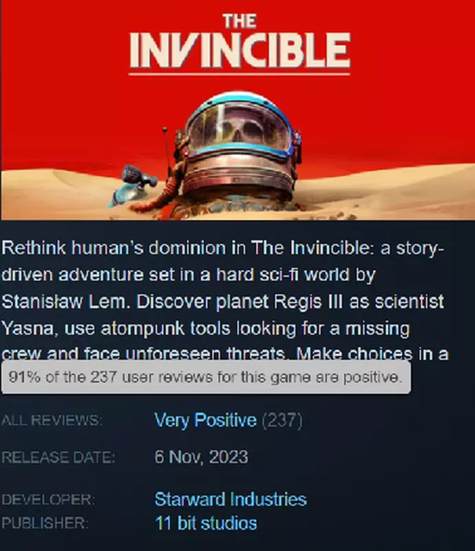 The Invincible hat unter den Spielern kein großes Aufsehen erregt, aber diejenigen, die es ausprobiert haben, waren begeistert! Das Spiel hat über 90% positive Bewertungen auf Steam