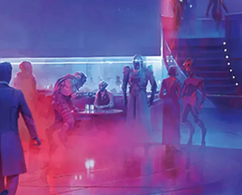 Darüber ist eine bunte Szene aus einem bestimmten Nachtclub zu sehen, vielleicht ist es sogar das Afterlife aus Mass Effect 2. Bei näherer Betrachtung sahen die Fans einen Vertreter der Angara-Rasse aus der Andromeda-Galaxie und einen der Geth.