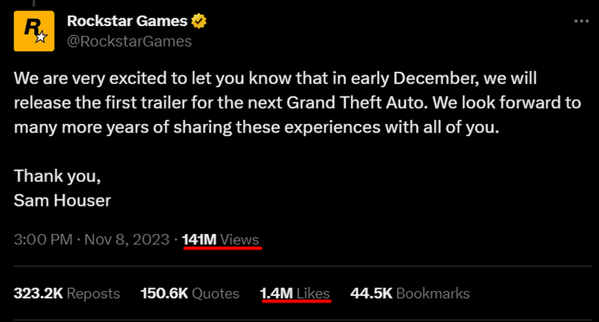 Am 8. November kündigte Rockstar Games an, dass es Anfang Dezember den ersten Trailer zu Grand Theft Auto 6 zeigen würde. Dies sorgte für so viel Aufsehen, dass die Ankündigung zum beliebtesten Gaming-Tweet auf Twitter wurde.